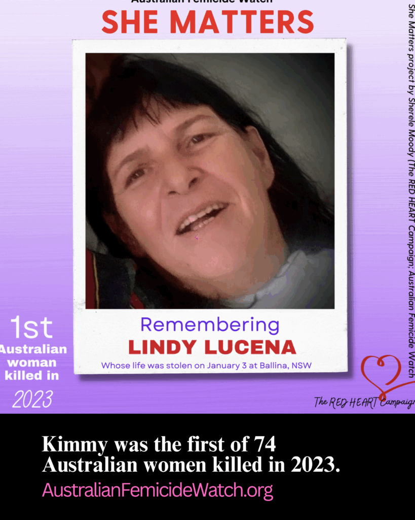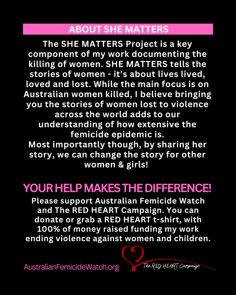 Please support The RED HEART Campaign and Australian Femicide Watch by donating or buying a RED HEART t-shirt! 100% of money raised funds a range of services and supports for families impacted by femicide and my work documenting the stories of women and children lost to violence.