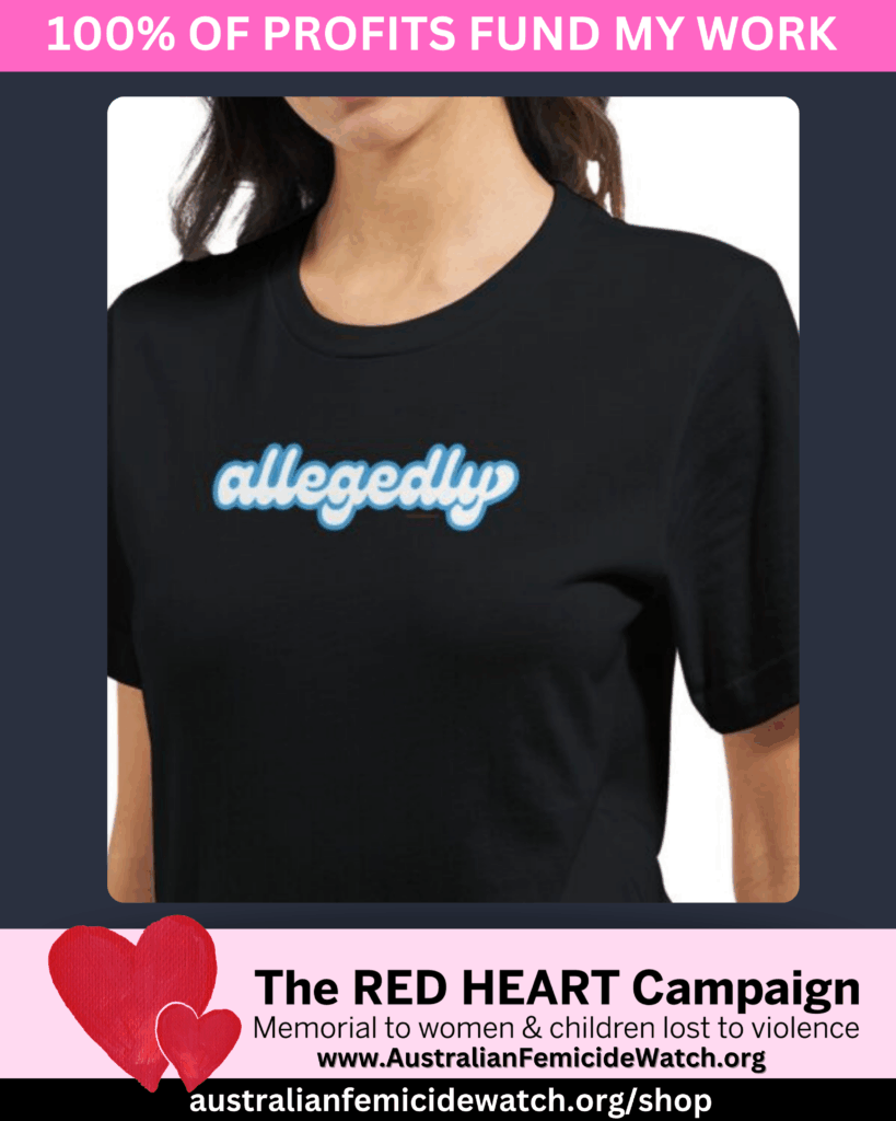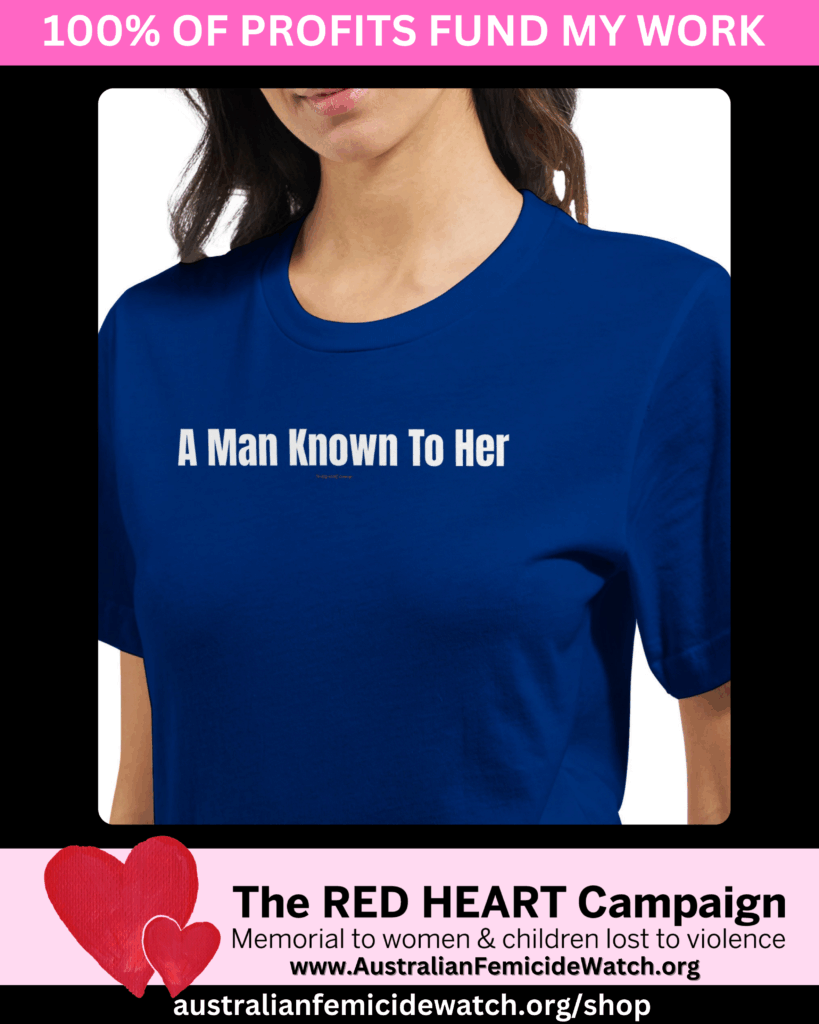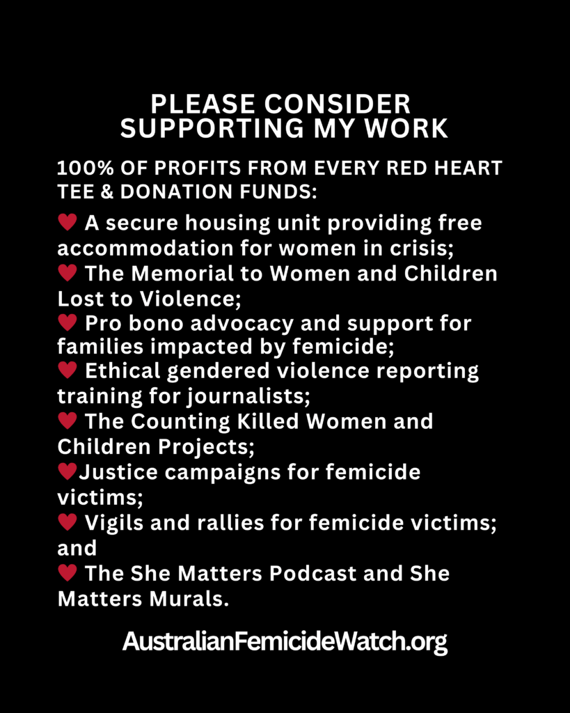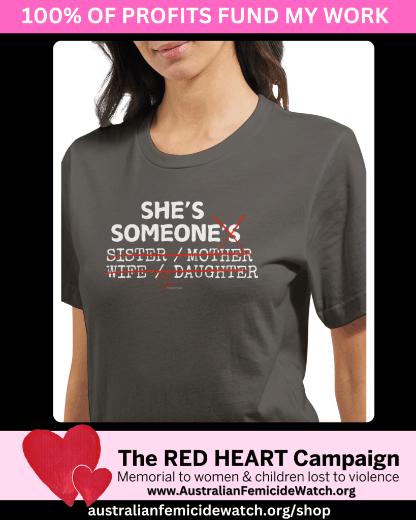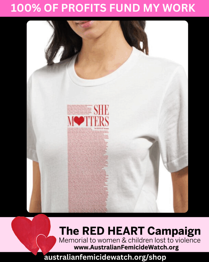 I need your help to support The RED HEART Campaign and Australian Femicide Watch. You can donate or buy a t-shirt! 100% of money raised funds RED HEART and Australian Femicide Watch.
