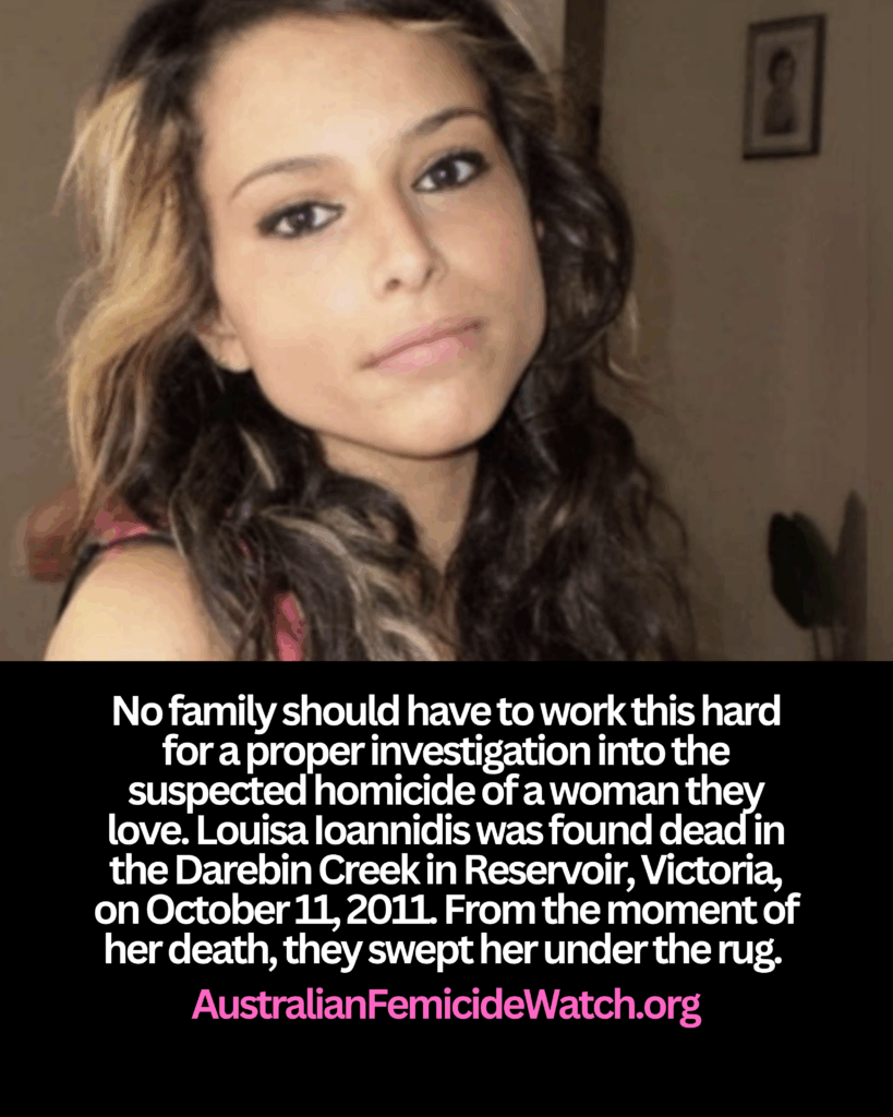 No family should have to work this hard for a proper investigation into the suspected homicide of a woman they love. Louisa Ioannidis was found dead in the Darebin Creek in Reservoir, Victoria, on October 11, 2011.