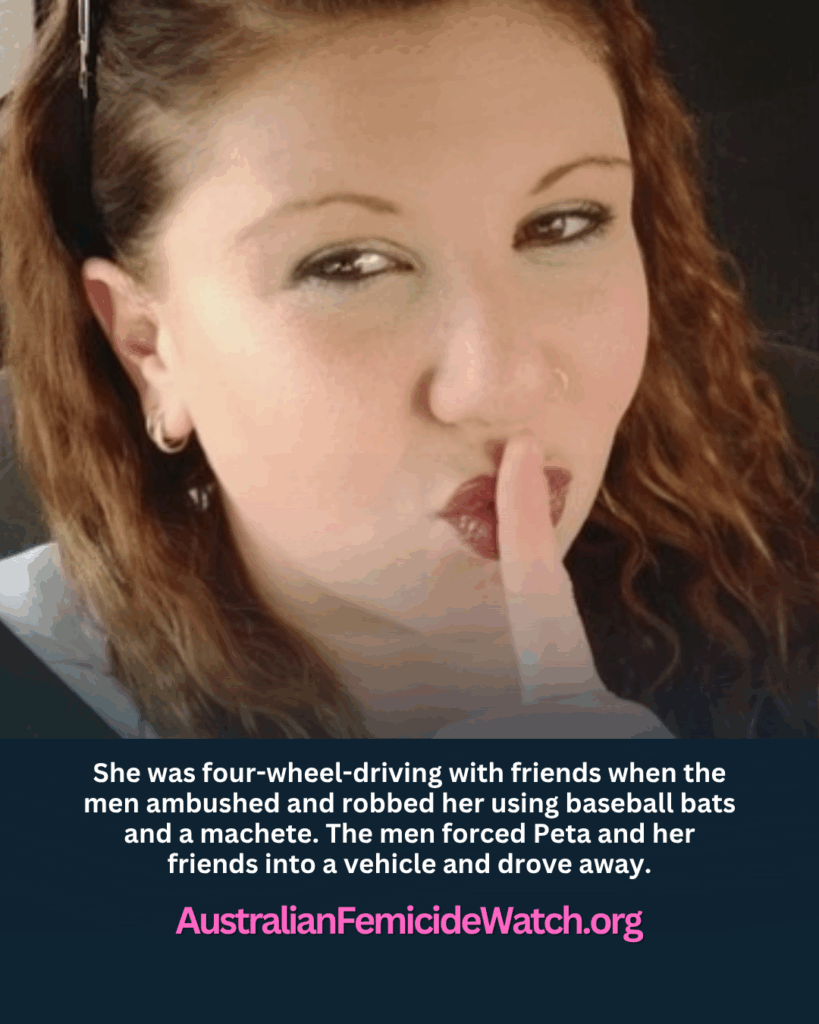 She was four-wheel-driving with friends when the men ambushed and robbed her using baseball bats and a machete. The men forced Peta and her friends into a vehicle and drove away.
