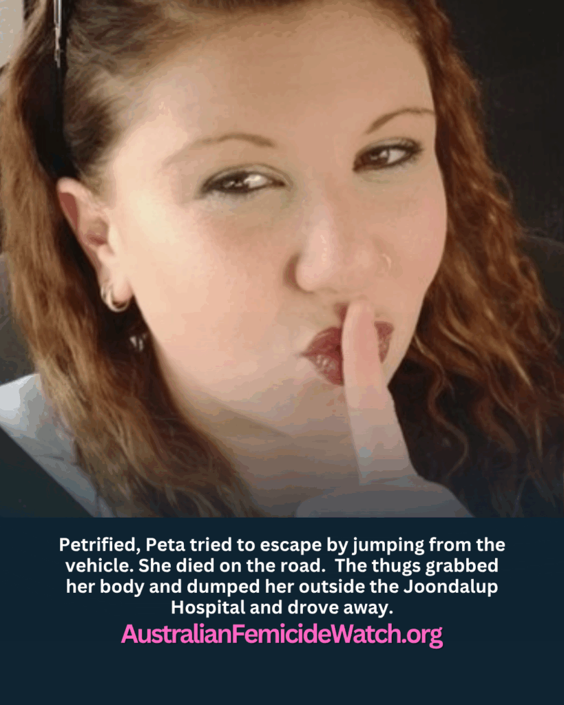 Petrified, Peta tried to escape by jumping from the vehicle. She died on the road. The thugs grabbed her body and dumped her outside the Joondalup Hospital and drove away.
