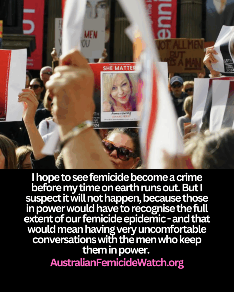 I hope to see femicide become a crime before my time on earth runs out. But I suspect it will not happen, because those in power would have to recognise the full extent of our femicide epidemic – and that would mean having very uncomfortable conversations with the men who keep them in power.