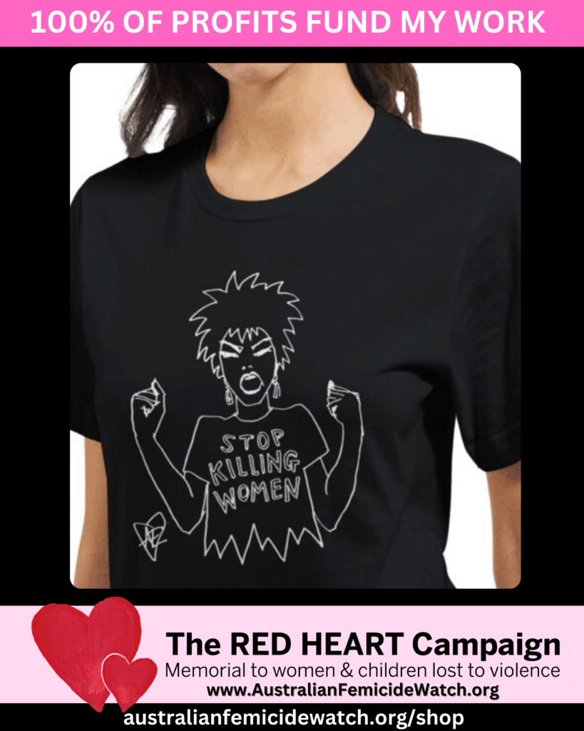I need your help to support The RED HEART Campaign and Australian Femicide Watch. You can donate or buy a t-shirt! 100% of money raised funds RED HEART and Australian Femicide Watch.