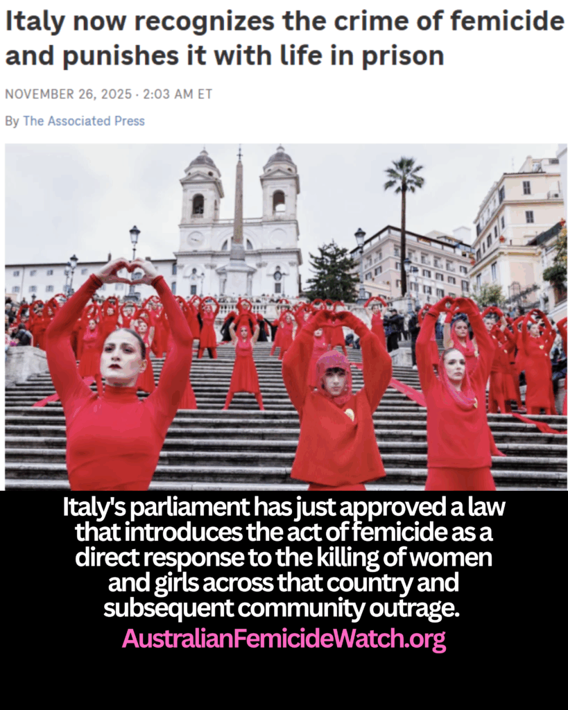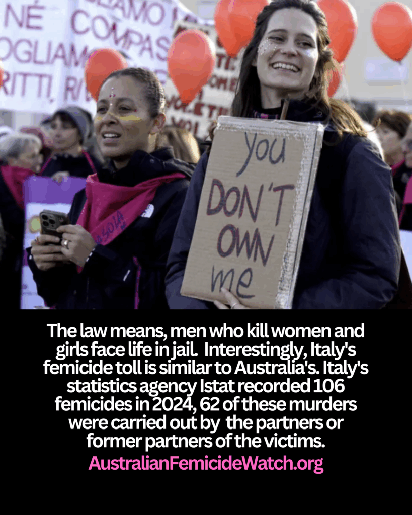 The law means, men who kill women and girls face life in jail. Interestingly, Italy’s femicide toll is similar to Australia’s. Italy recorded 106 femicides in 2024, 62 of these murders were carried out by the partners or former partners of the victims.