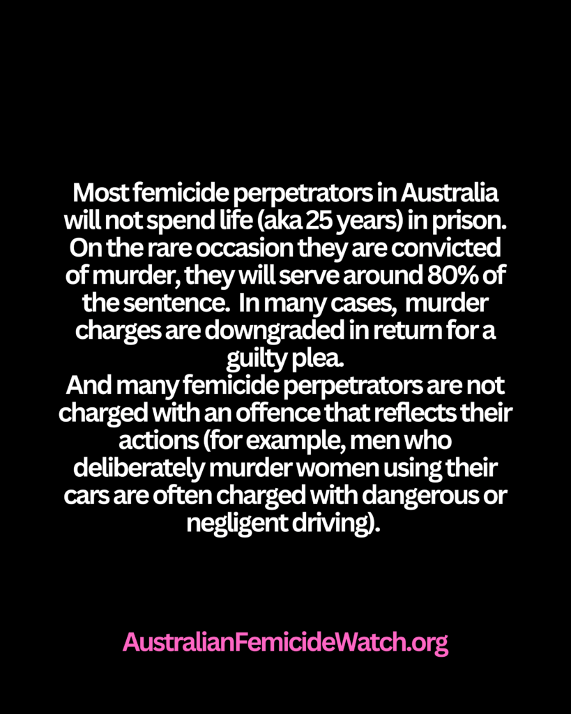 Most femicide perpetrators in Australia will not spend life in prison. On the rare occasion they are convicted of murder, they will serve around 80% of the sentence. Often murder charges are downgraded in return for a guilty plea.
