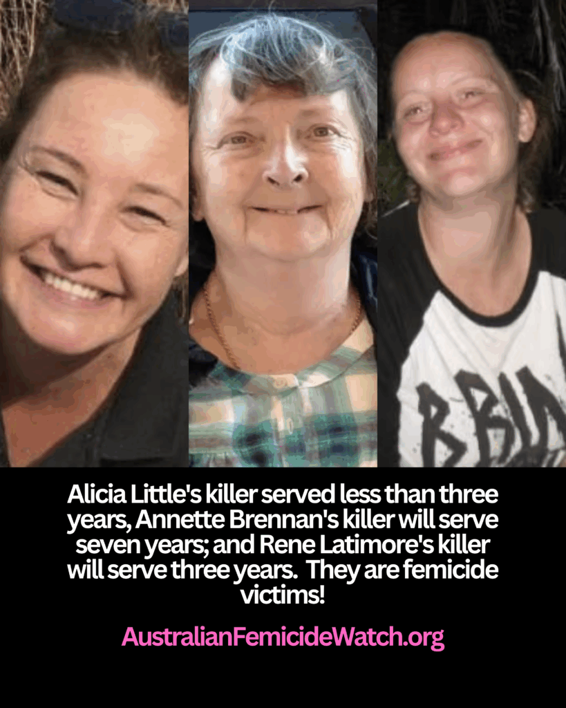 Alicia Little’s killer served less than three years; Annette Brennan’s killer will serve seven years; and Rene Latimore’s killer will serve three years. They are femicide victims!