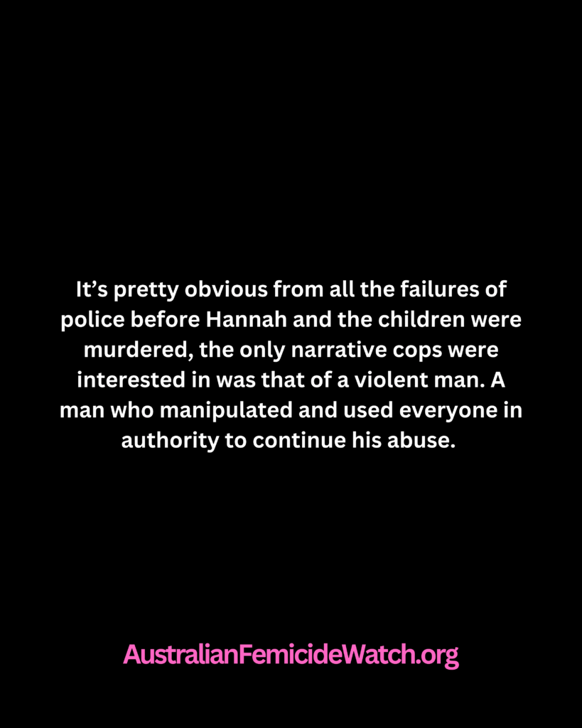 It’s pretty obvious from all the failures of police before Hannah and the children were murdered, the only narrative cops were interested in was that of a violent man who manipulated and used everyone in authority to continue his abuse.