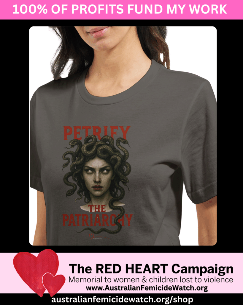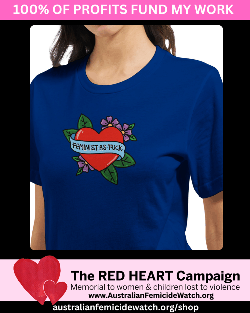 I need your help to support The RED HEART Campaign and Australian Femicide Watch. You can donate or buy a t-shirt! 100% of money raised funds RED HEART and Australian Femicide Watch.