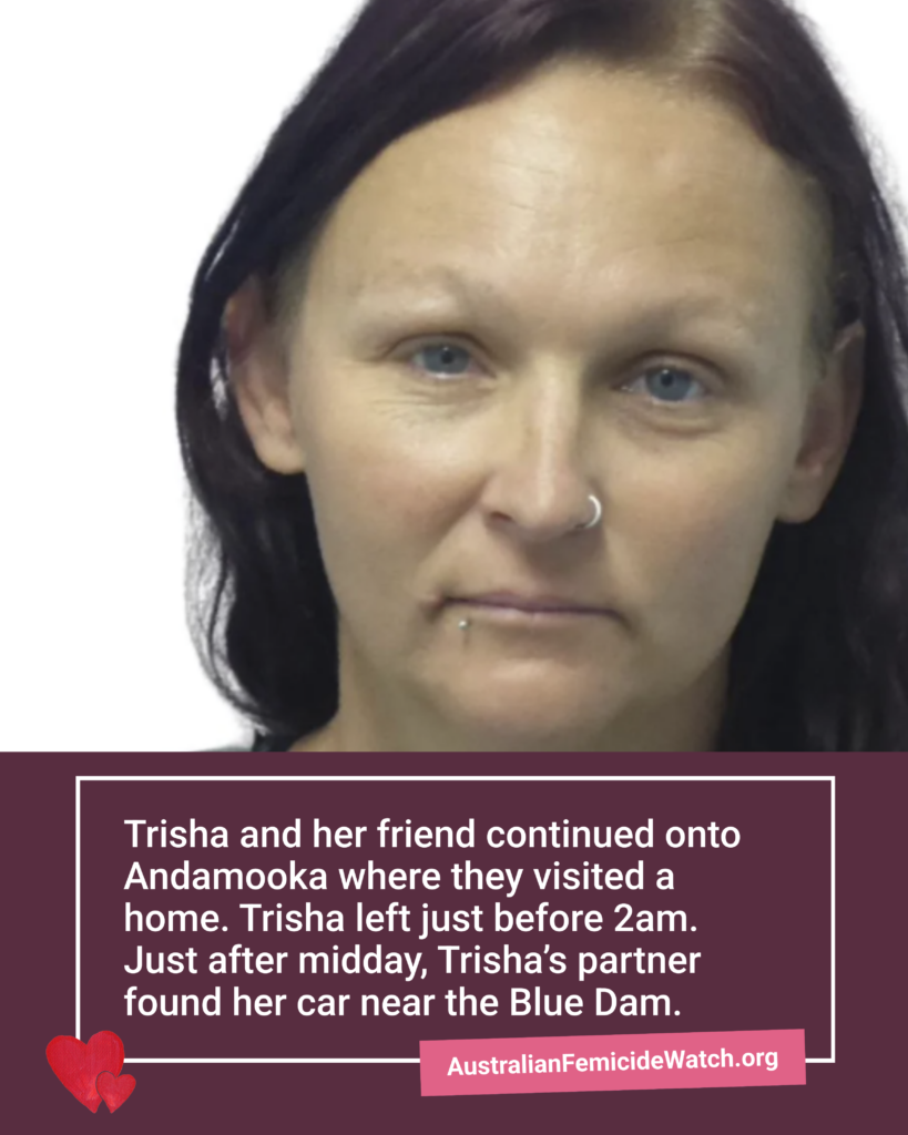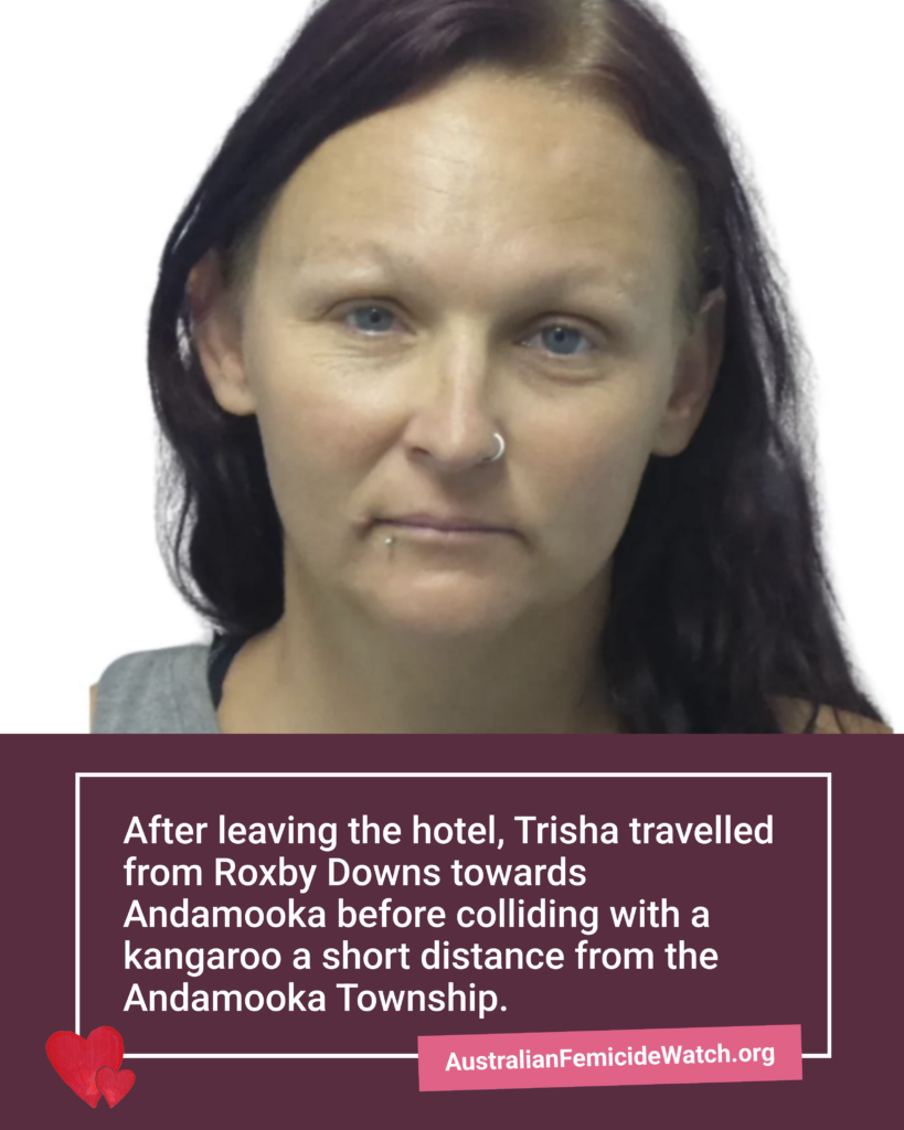 Trisha was at the Roxby Downs hotel at 12.19am that day. She left a short time later with a friend in a white 2012 Ford Territory, SA registration S254BCX.