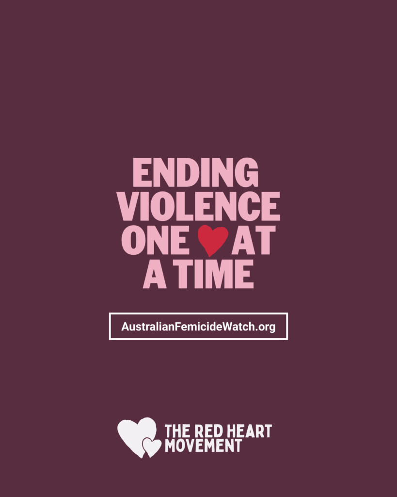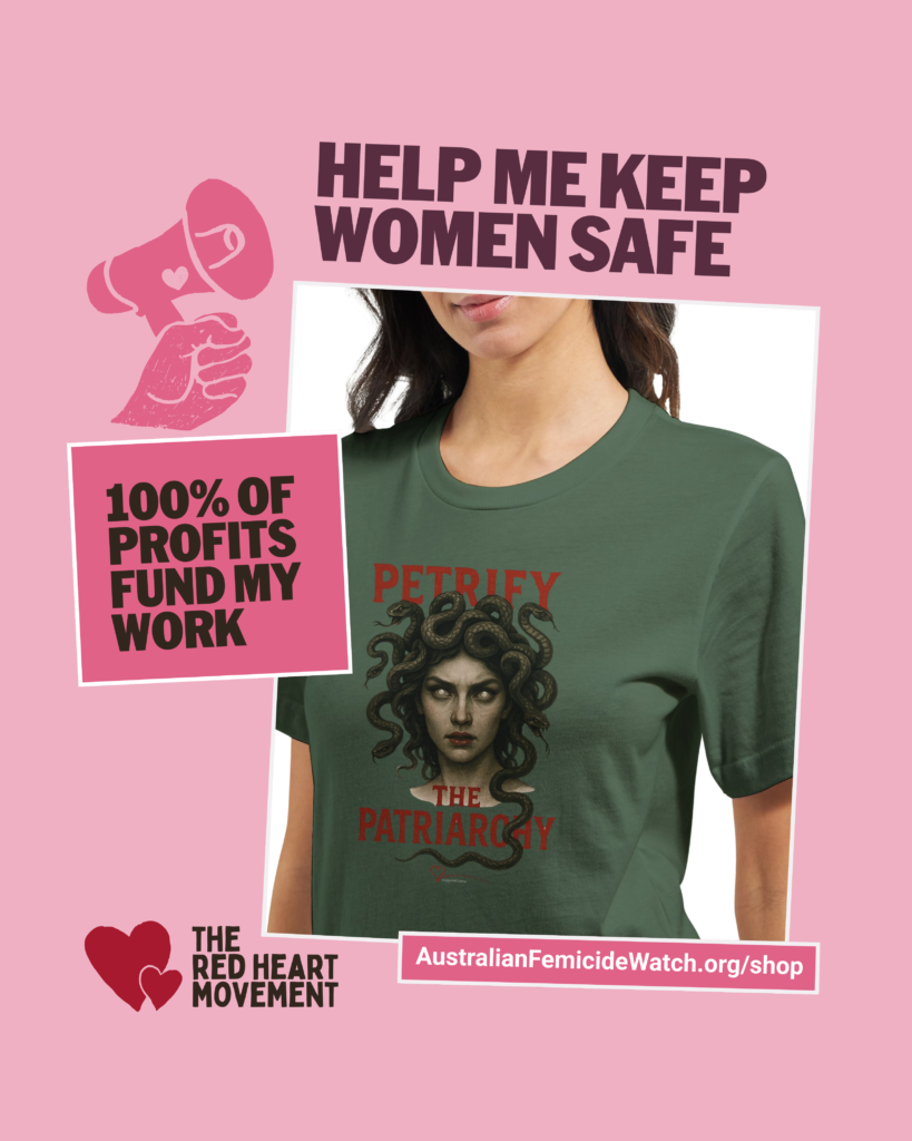 I need your help to support The RED HEART Movement and Australian Femicide Watch. You can donate or buy a t-shirt! 100% of money raised funds RED HEART and Australian Femicide Watch.