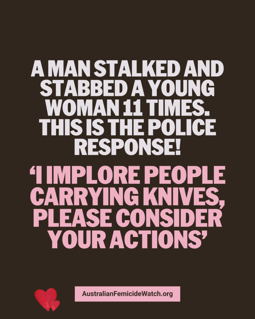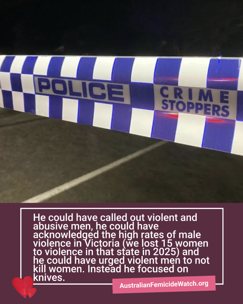 He could have called out violent and abusive men, he could have acknowledged the high rates of male violence in Victoria (we lost 15 women to violence in that state in 2025) and he could have urged violent men to not kill women. Instead he focused on knives.