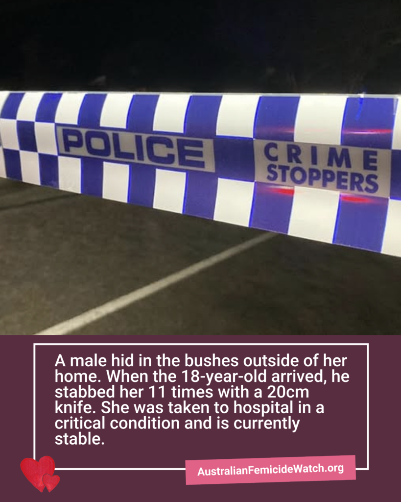 A male hid in the bushes outside of her home. When the 18-year-old arrived, she stabbed her 11 times with a 20cm knife. She was taken to the hospital in a critical condition and is currently stable.