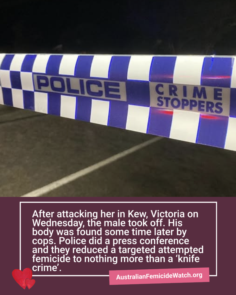 After attacking her in Kew, Victoria on Wednesday, the male took off. His body was found some time later by cops. Police did a press conference, and they reduced a targeted attempted femicide to nothing more than a ‘knife crime’.