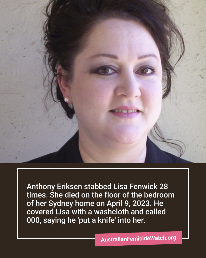 Anthony Eriksen stabbed Lisa Fenwick 28 times. She died on the floor of the bedroom of her Sydney home on April 9, 2023.