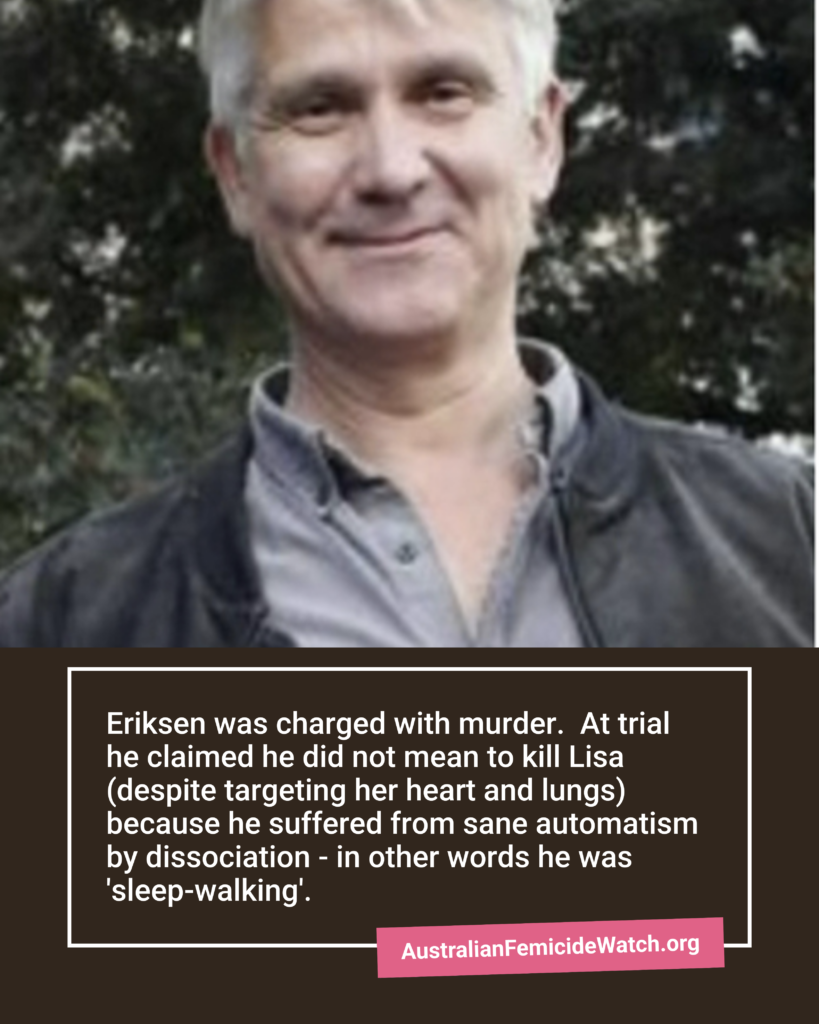 At trial he claimed he did not mean to kill Lisa (despite targeting her heart and lungs) because he suffered from sane automatism by dissociation – in other words he was ‘sleep-walking’.