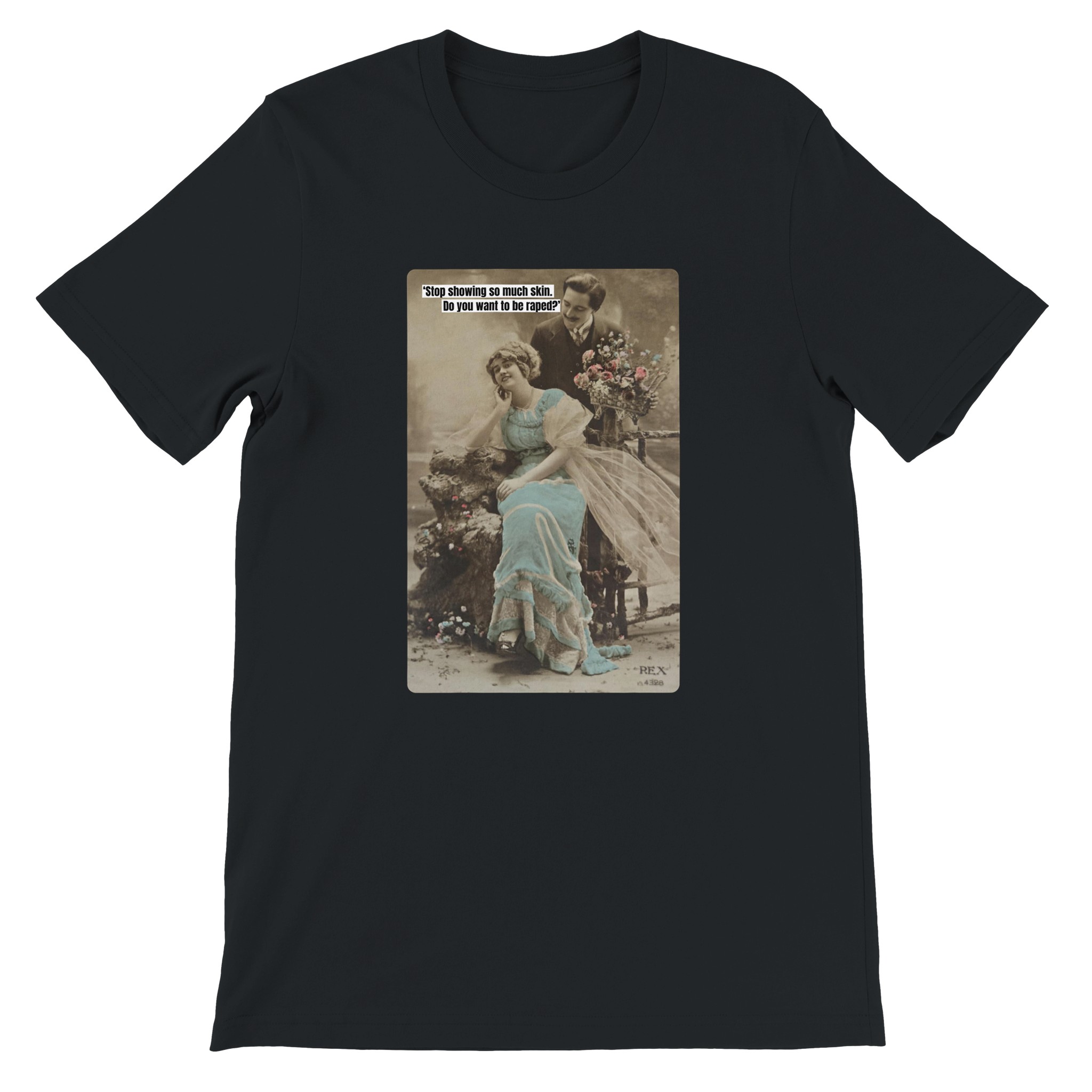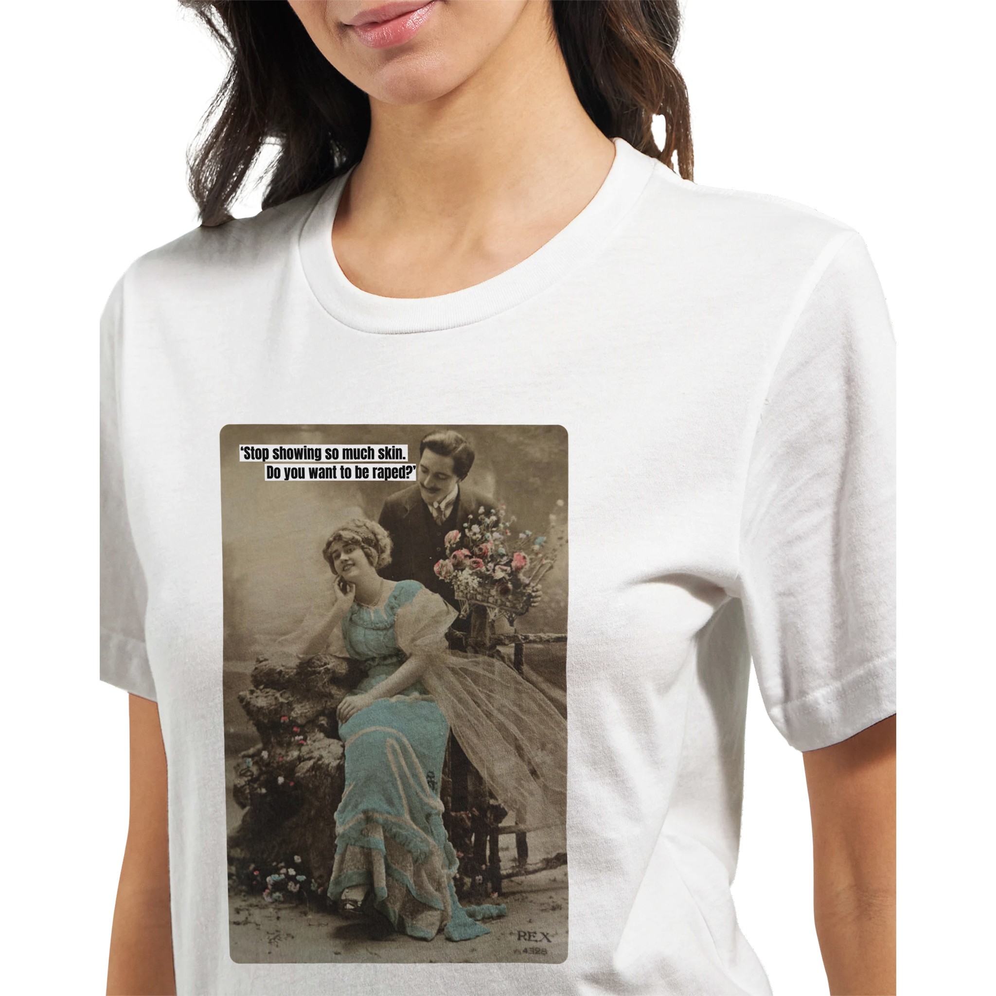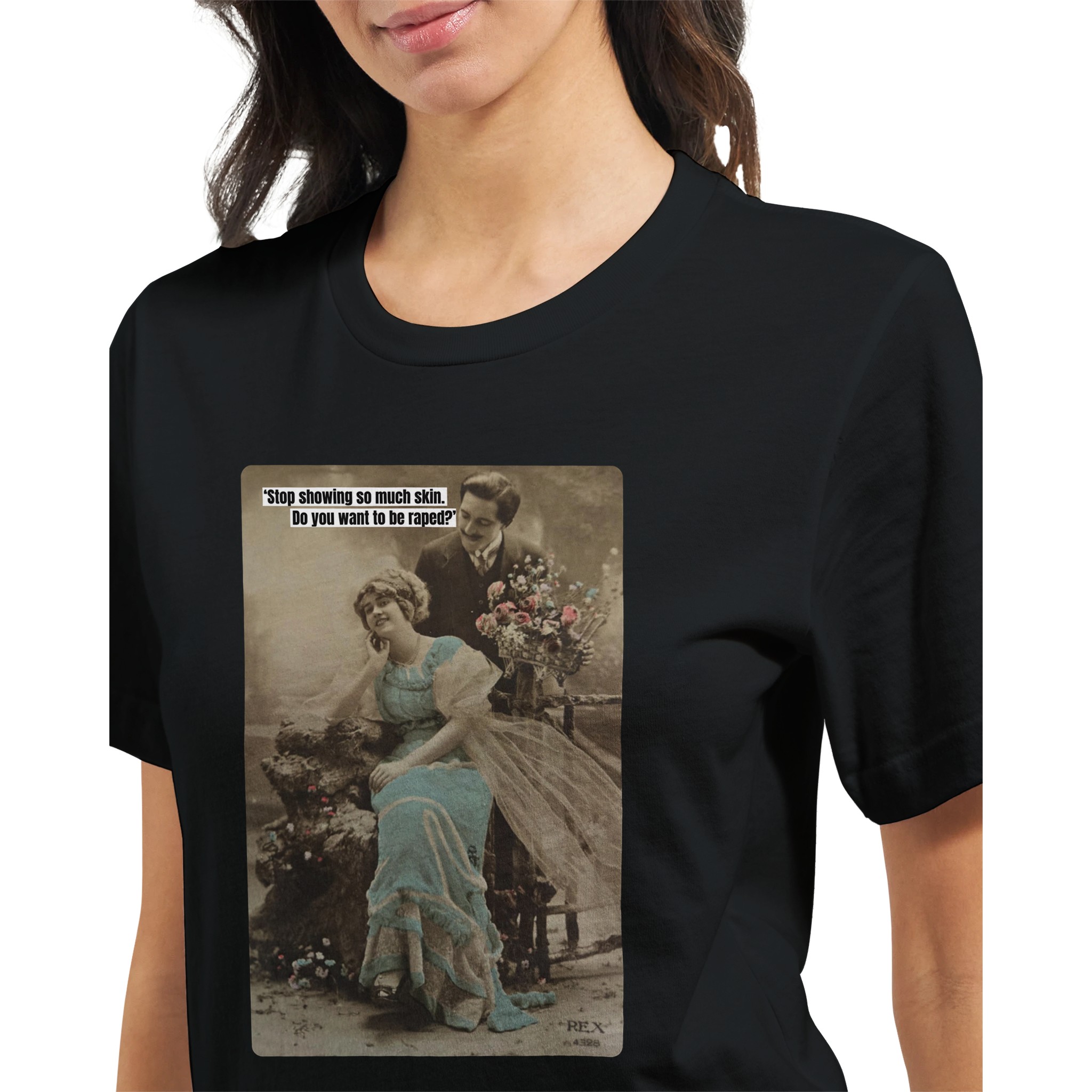 This is a re-coloured and re-purposed postcard from decades ago. It is part of a series of designs showing everyday sexism women face – from being blamed for rape and murder to just trying to navigate medical care and other normal life processes.