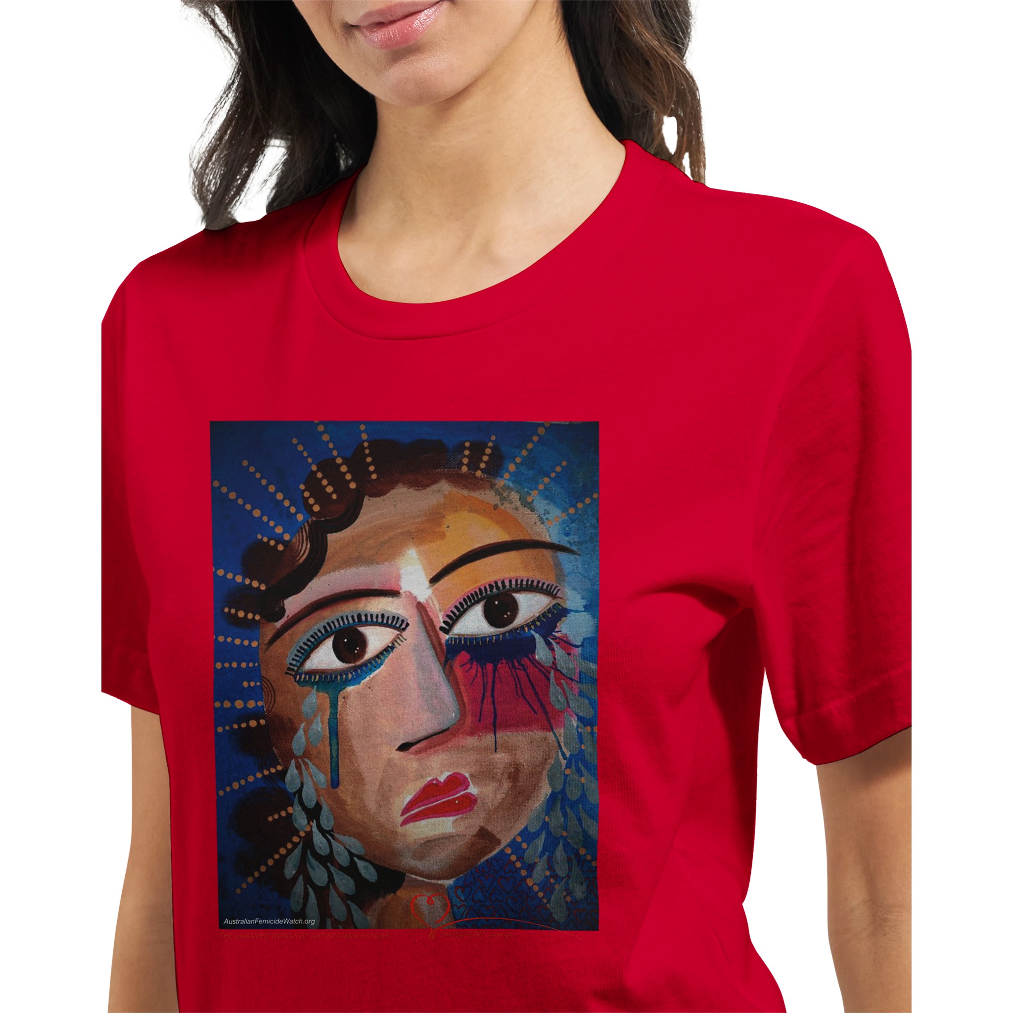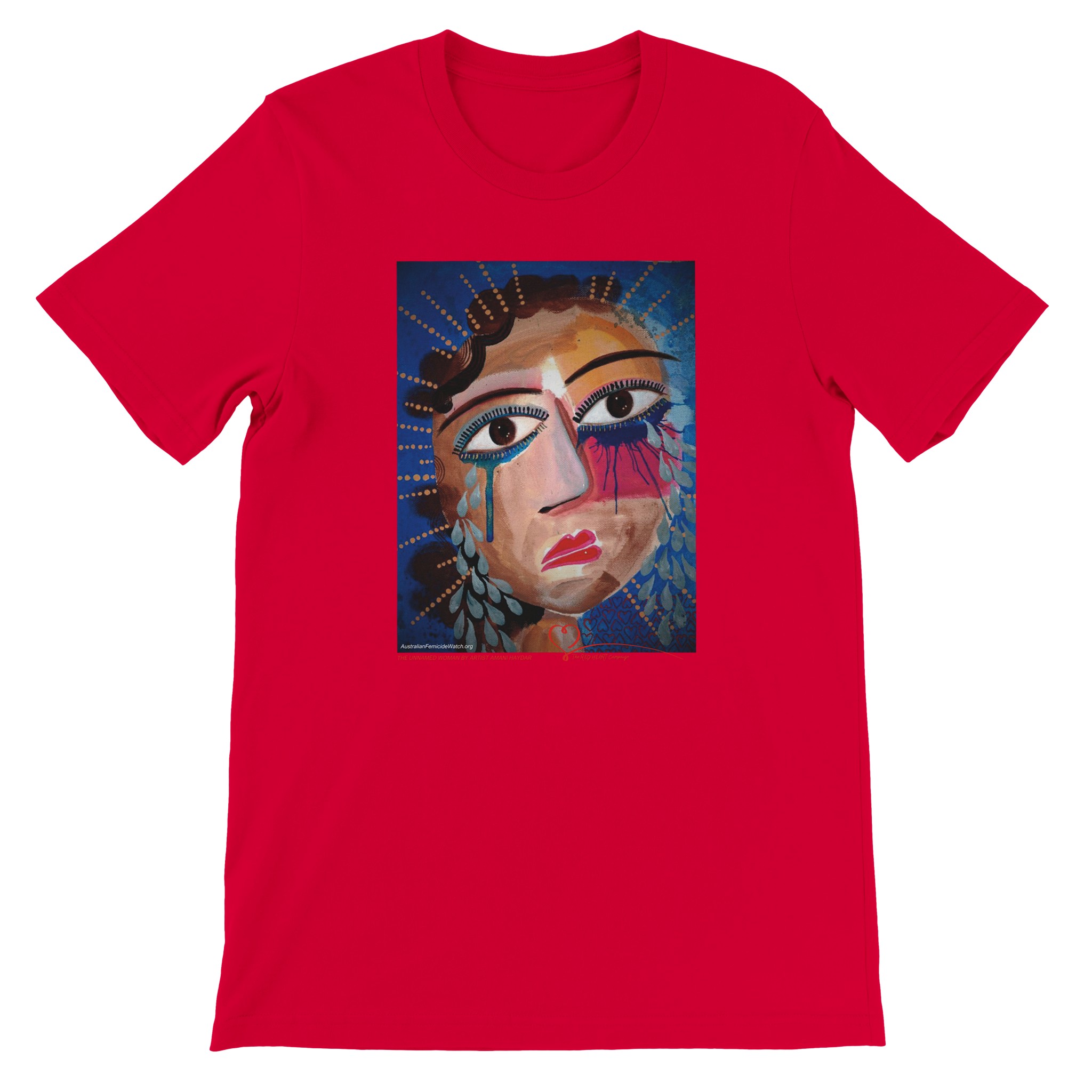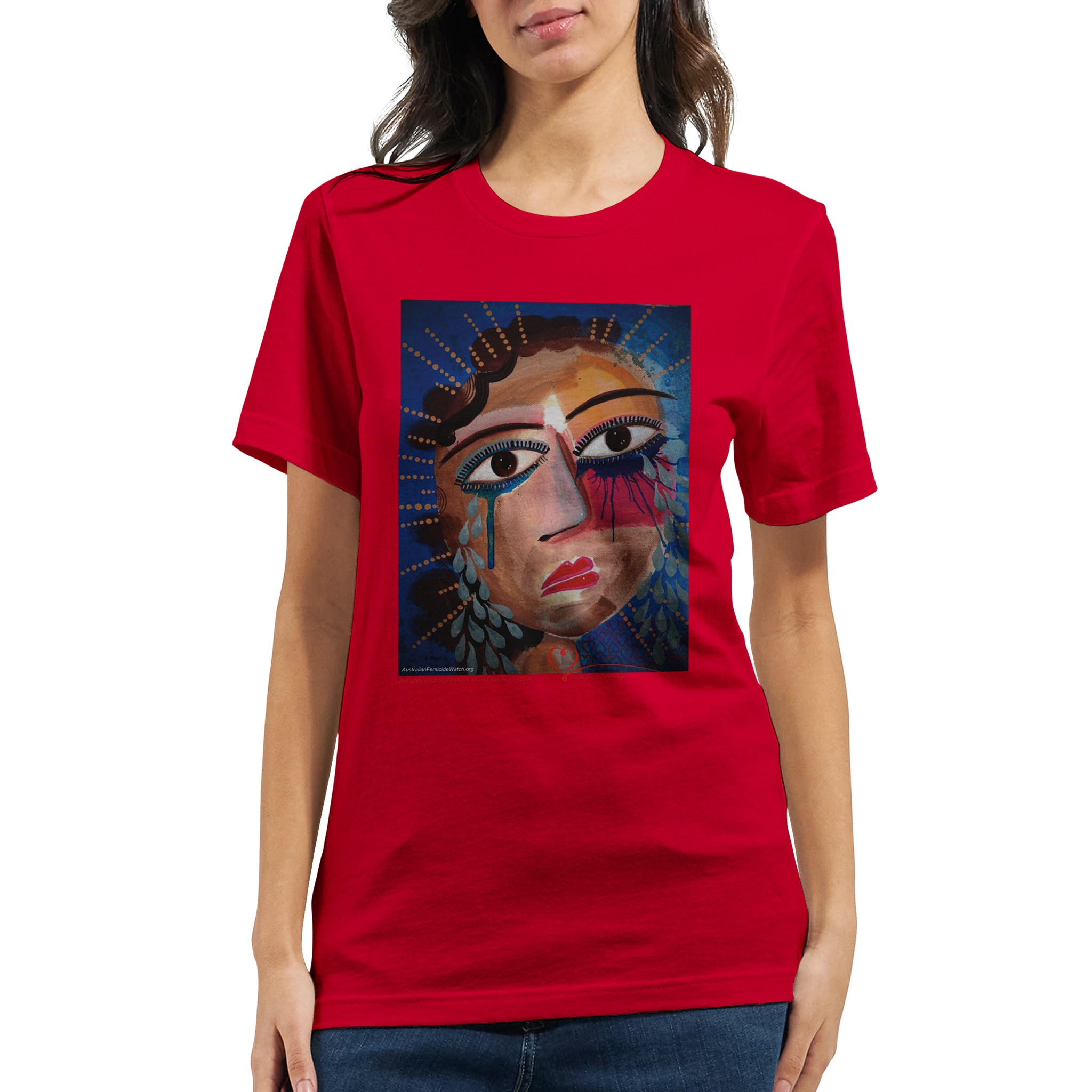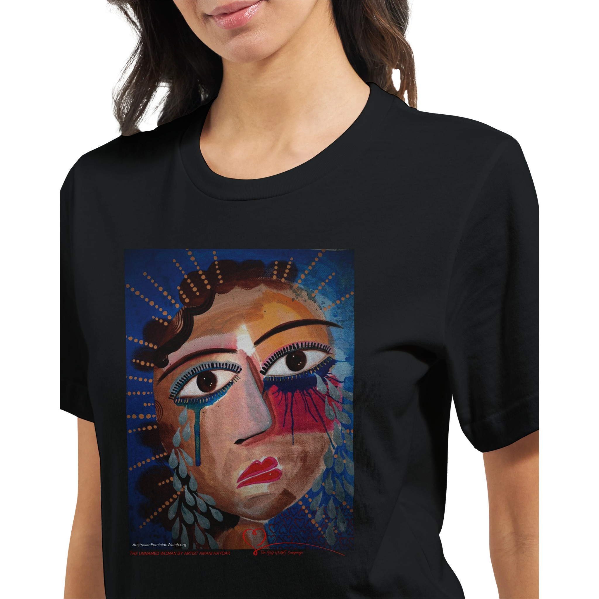 The Unnamed Woman is an exclusive artwork by Australian artist, anti-violence advocate and author Amani Haydar. This image is used in The RED HEART Campaign’s Memorial to Women and Children to represent unidentified Australian women lost to violence. In Australia, a woman is killed every four days and a child every four weeks. Almost all of their lives are erased by violent men and as a result of domestic violence. Australian Femicide Watch and The RED HEART Campaign document every woman and child killed in Australia. When you buy this t-shirt – and all of our other products – 100% of profits fund this vital work. Help change the story for Australian women and children. Their lives matter!