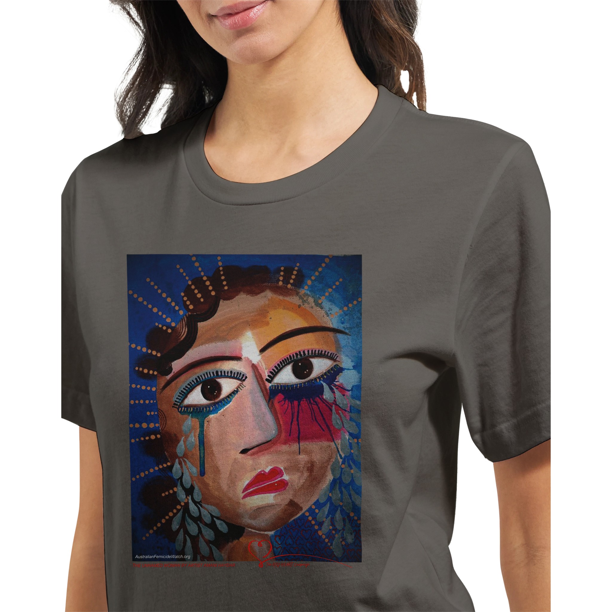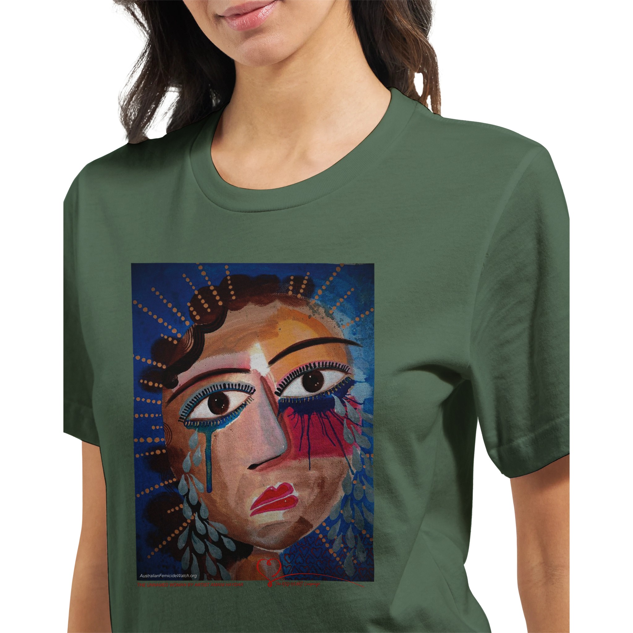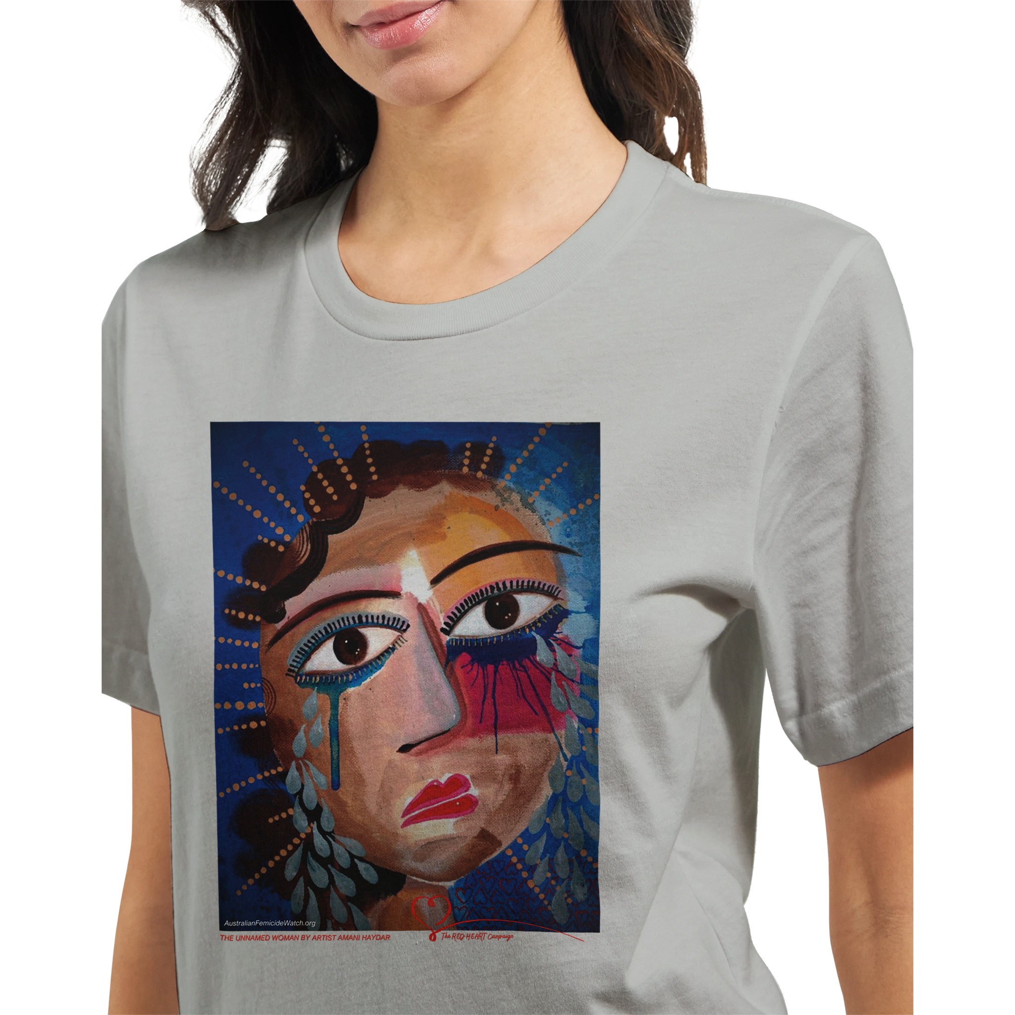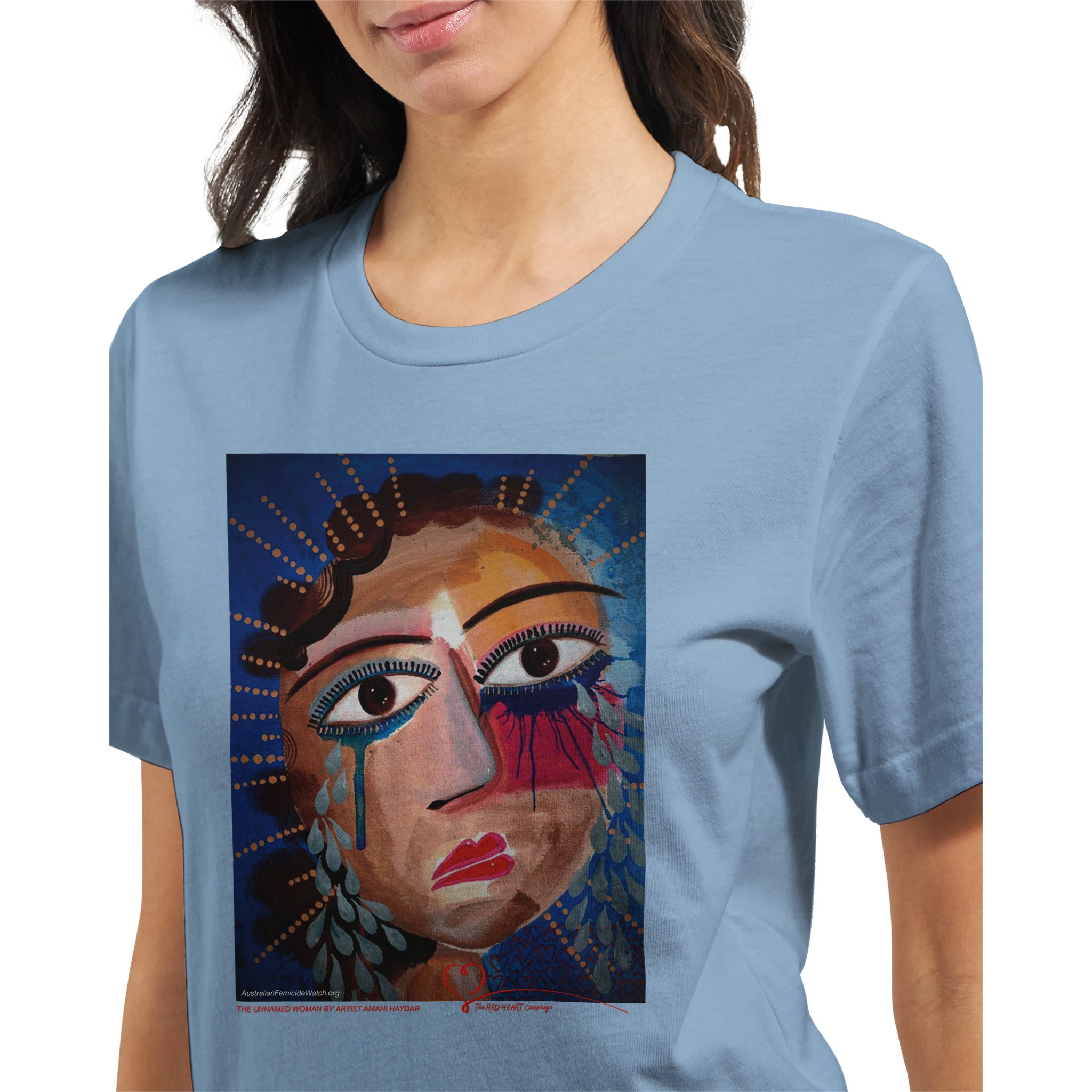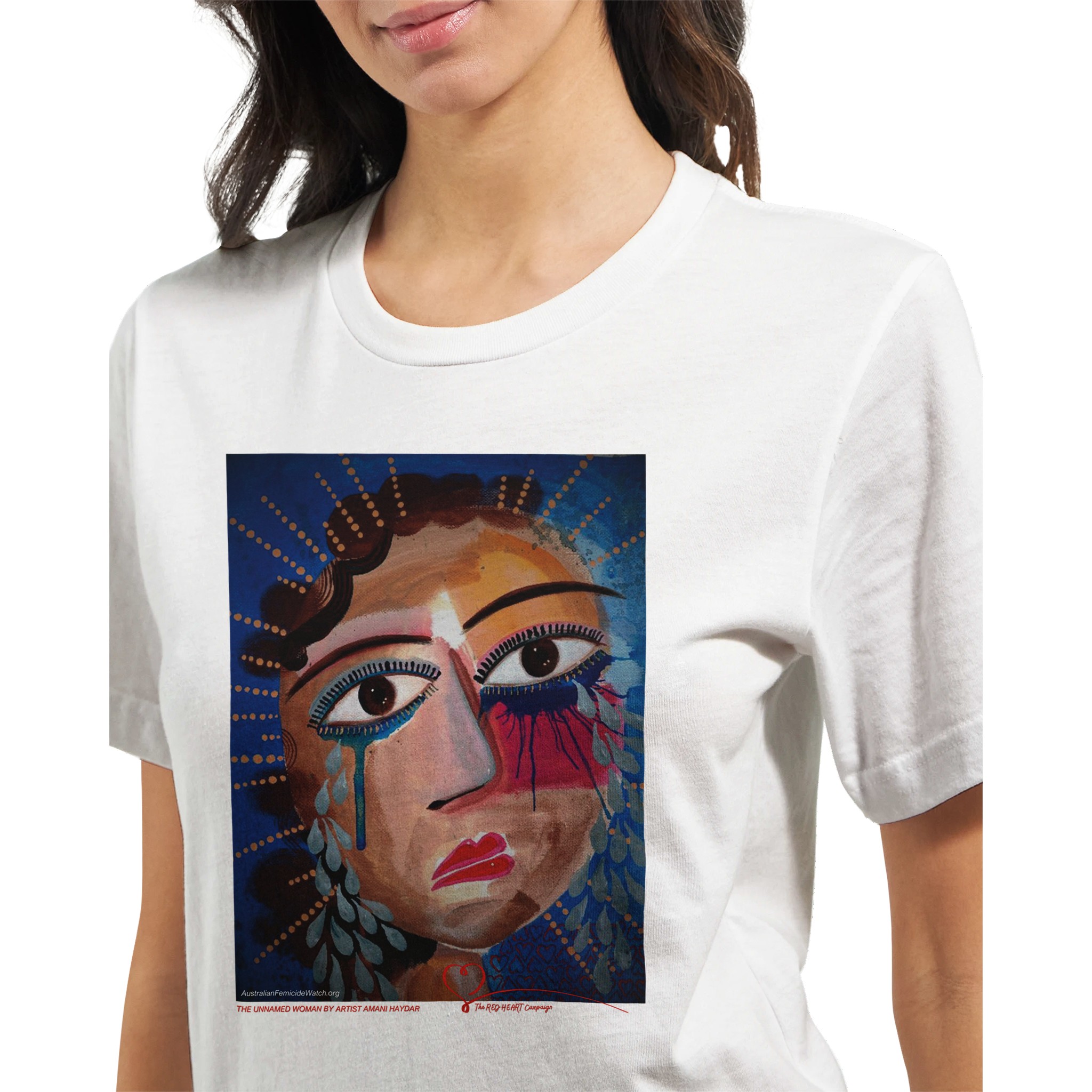 The Unnamed Woman is an exclusive artwork by Australian artist, anti-violence advocate and author Amani Haydar. This image is used in The RED HEART Campaign’s Memorial to Women and Children to represent unidentified Australian women lost to violence. In Australia, a woman is killed every four days and a child every four weeks. Almost all of their lives are erased by violent men and as a result of domestic violence. Australian Femicide Watch and The RED HEART Campaign document every woman and child killed in Australia. When you buy this t-shirt – and all of our other products – 100% of profits fund this vital work. Help change the story for Australian women and children. Their lives matter!