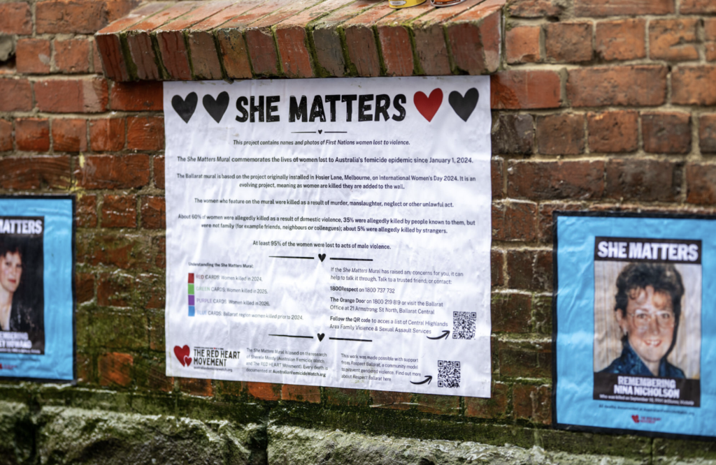 The Mural features the faces and names of the Australian women killed since January 1, 2024. It has a special section for Ballarat women killed before this date. The wall will remain in place for at least one year. As with the Hosier Lane Mural, as women are killed, the Ballarat mural will grow.